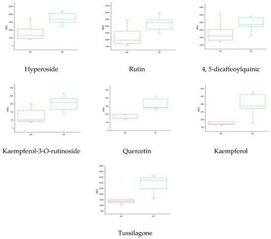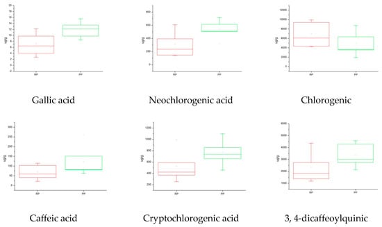 A box plot is a tool that can improve our understanding of quantitative information. It consists of five numerical points: minimum, lower quartile, median, upper quartile, and maximum. It can also add a mean to the box. There are always a variety of outliers in the real data, so in order not to cause the overall features to be offset, these outliers are drawn separately, and the two levels of the beard in the box plot are modified to the minimum and maximum observations []. In this experiment, the box plot was combined with PCA and HCA to analyze the quality of the raw and processed FF. It can be seen from the results of the box plot that the content of the thirteen Q-markers in the processed FF is significantly higher than that of the raw FF except with respect to chlorogenic acid (Figure 5). The results show that the established method is suitable for analyzing the differences between raw and processed FF from different sources by using 13 compounds as Q-markers. Moreover, it provides a new way to quickly and directly analyze the differences between raw and processed TCMs.