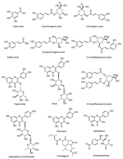 HPLC-grade methanol was purchased from Fisher Scientific (Pittsburgh, PA, USA). Formic acid of HPLC-grade was purchased from Dikma Co. (USA), and the water was Wahaha purified water purchased from the Hangzhou Wahaha group (Hangzhou, China). Other reagents and chemicals were all of analytical grade. The reference standards of gallic acid (GA), neochlorogenic acid (5-CQA), chlorogenic acid (3-CQA), caffeic acid (CA), cryptochlorogenic acid (4-CQA), 3,4-dicaffeoylquinic acids, hyperoside (3,4-diCQA), rutin, 4,5-dicaffeoylquinic acids (4,5-diCQA), kaempferol-3-O-rutinoside, quercetin, kaempferol, and tussilagone and the internal standard (IS) of chloramphenicol were purchased from Chengdu Must Biotechnology (Chengdu, China). The structure of the thirteen Q-markers and IS are shown in Figure 6. All the reference standards and the IS had high purities, which were greater than 98%, and they were suitable for UPLC-QQQ-MS/MS analysis.