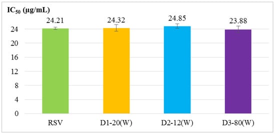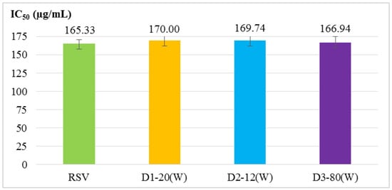 DPPH radical scavenging activity of RSV and RSV transfersomes (D1–20(W), D2–12(W), and D3–80(W) groups). The IC50 value is the sample to remove the 50% DPPH radicals (2.4 × 10−4 M) required concentration. The values are means ± SD.