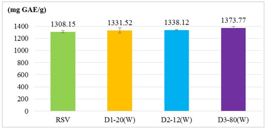 Total phenolic content of RSV and RSV transfersomes (D1–20(W), D2–12(W), and D3–80(W) groups). Total flavonoid content was measured by the Folin–Ciocalteu method and the results are presented as gallic acid equivalent (GAE). The 40 μL of sample was reacted with 40 μL of 2 N Folin-Ciocalteu reagent in a total volume of 600 μL. The values are means ± SD.