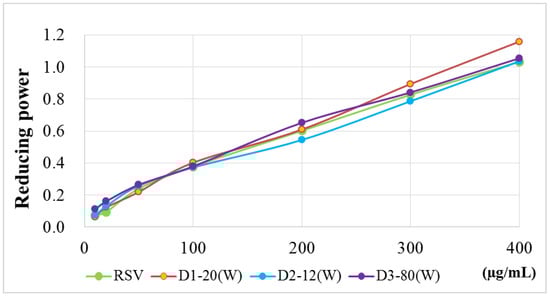 Reducing power of RSV and RSV transfersomes (D1–20(W), D2–12(W), and D3–80(W) groups). The ability of samples with various concentrations reduced 1% potassium ferricyanide (K3Fe(CN)6) is presented as the reducing power.