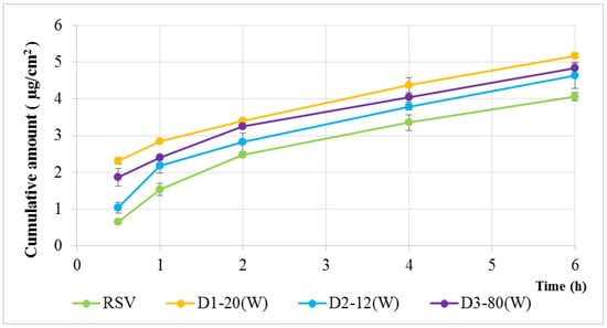In vitro release profiles of RSV and RSV transfersomes (D1–20(W), D2–12(W), and D3–80(W) groups). The sample with 1.0 mL was placed in the donor site and 5.0 mL consisting of PBS and ethanol (70:30, v/v) was put into the receptor site. These sites were separated with a 0.785 cm2 Strat-M® Membrane. The cumulative amount of RSV was analyzed in each time points.