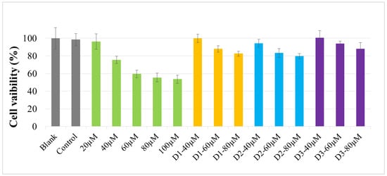 This study was conducted using different concentrations of RSV (20, 40, 60, 80, 100 μM) and transfersomes (40, 60, 80 μM). The cell viability (MTT assay) is shown in Figure 6. It was found that the cell viabilities of the transfersomes were all higher than 83%, among which D3-80(W) had the lowest cytotoxicity. Moreover, if the resveratrol concentrations of transfersomes are lower than 40 μM, almost no cytotoxicity is observed (data not shown). However, compared with the same concentration of RSV (40 to 80 μM), the cytotoxicity of transfersome was significantly reduced. The results demonstrate that RSV can diminish its cytotoxicity after the encapsulation; therefore, transfersomes are safer than RSV.