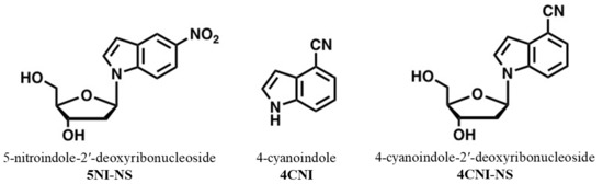 - Passow, K.T.; Harki, D.A. 4–Cyanoindole-2′-deoxyribonucleoside (4CIN): A universal fluorescent nucleoside analogue. Org. Lett. 2018, 20, 4310–4313. [Google Scholar] [CrossRef]