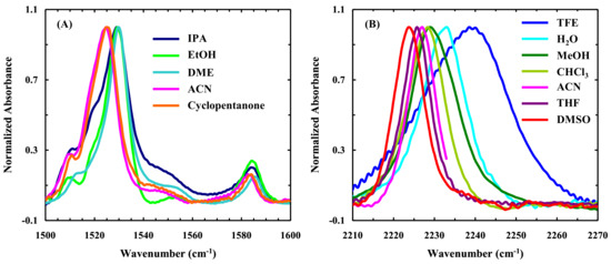 - Błasiak, B.; Londergan, C.H.; Webb, L.J.; Cho, M. Vibrational probes: From small molecule solvatochromism theory and experiments to applications in complex systems. Acc. Chem. Res. 2017, 50, 968–976. [Google Scholar] [CrossRef]