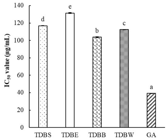 In the case of the ABTS assay, antioxidants in samples reacting with an organic cation radical named ABTS•+ are the basis for this test. In the mixture, with the presence of antioxidants, the nitrogen atom of ABTS•+ quenches the hydrogen atom of antioxidants yielding the solution decolorization []. The decolorization of ABTS•+ solution illustrates the antioxidant capacity of samples. As shown in Table 2, except for TDBE extract, all TDB extracts presented more powerful activity on ABTS assay than the standard BHT. Of which, IC50 values of TDBB and TDBW were 1.7-times higher than that of BHT. Additionally, the TDBS extract was 1.3-times the antioxidant activity of BHT.