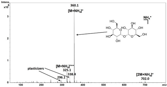 Single stage mass spectrum of trehalose, a disaccharide found e.g., in insects. Due to the lack of basic residues in the molecule, [M + H]+ ions could not be detected if the sample was dissolved in acetonitrile-water 1:1 (v/v) solvent mixture, containing 0.1% acetic acid (spectrum not shown). However, using 5 mM of ammonium acetate in water resulted in the above spectrum. Although absolute intensity is still low, the ammonium adduct of trehalose and its cationized dimer could also be detected. Also, a possible in-source fragmentation product can be seen at m/z 325 displaying a neutral loss of water (°) and ammonia (*). Note the peaks corresponding to m/z 296.1 and m/z 338.4 are very likely the [M + NH4]+ ion of dibutyl phtalate and [M + H]+ ion of erucamide, respectively, which are common plasticizers leaked from plastic sample tubes.
