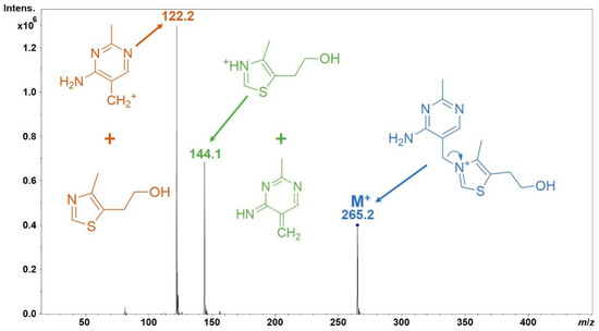 Illustration of Field’s rule on thiamine (vitamin B1) in positive mode (ES+). Note that the precursor in blue is not a protonated thiamine molecule [M + H]+, but simply an M+, as the compound intrinsically has a fixed positive charge. Upon collision-induced dissociation, it decomposes via two different pathways (orange and green colors) to yield product ions (upper structures) and neutral molecules (lower structures). The pathway in orange represents an inductive cleavage (see also Scheme 1), while the one in green indicates an acyclic hydrogen rearrangement competitive with the former. Only charged fragments could be detected (upper structures), and their intensities are proportional to their neutral forms’ proton affinity. Note that the fragments could be represented with multiple other (more stable) resonance structures; here, only one of each is depicted due to didactic reasons.