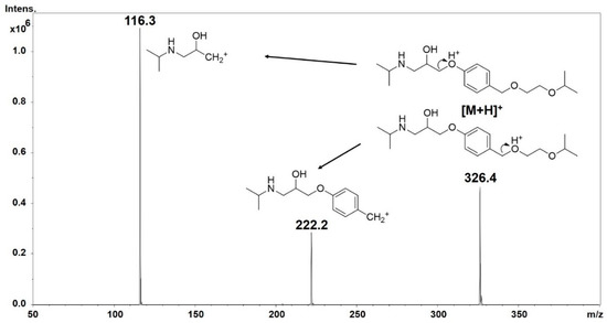 Tandem mass spectrum of bisoprolol, a cardioselective β-blocker. The initial site of protonation is the basic sp3 N. Without this moiety, the molecule cannot be detected. After collision-induced activation, the precursor ion [M + H]+ can be represented by two structures. All two fragments of the precursor ion are a result of inductive cleavages in concordance with Scheme 1, green arrows (in this case, X = O, Y = CH2). Note that these fragments not necessarily represent the most stable resonance structures.
