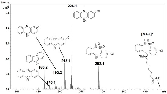 - Demarque, D.P.; Crotti, A.E.M.; Vessecchi, R.; Lopes, J.L.C.; Lopes, L.P. Fragmentation reactions using electrospray ionization mass spectrometry: An important tool for the structural elucidation and characterization of synthetic and natural products. Nat. Prod. Rep. 2016, 33, 432–455. [Google Scholar] [CrossRef] [PubMed]