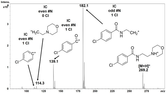 The application of all rules concerning fragmentation on the example of protonated moclobemide, a reversible monoamine oxidase inhibitor. IC stands for inductive cleavages and all the fragments could be explained by this route alone. There is no sign of violation of the even-electron rule. Note the characteristic isotope pattern which could be attributed to a single chlorine atom in the precursor and some of the fragments. An even m/z value (rounded to integer) implies an uneven number of nitrogens in the given ion and vice versa for an even-electron ion which is in concordance with the nitrogen rule.