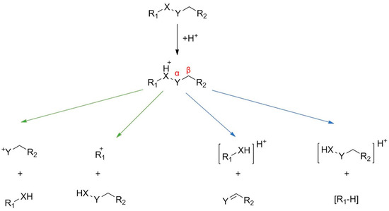 Bond cleavages upon the decomposition of an ion can be sorted as either homolytic or heterolytic. Another type of characterization of the fragmentation processes is based on the retention of the charge. In case of charge retention fragmentations (CRF) the charge is retained on the atom possessing the charge initially, while in case of charge migration fragmentations (CMF) charge is transferred to one of the atoms in the other fragment. The most fundamental fragmentation pathways of positively charged even-electron ions are summarized in Scheme 1. For more specific examples, see Figure 3, Figure 4, Figure 5 and Figure 6 (from the authors’ own works) or Niessen et al. [2,35].