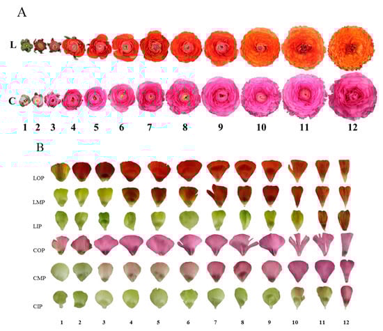 Flowers and petals at 12 development stages and three layers of two varieties of Ranunculus asiaticus L. (A) flowers; (B) petals; L: ‘Jiaoyan zhuanhong’; C: ‘Jiaoyan yanghong’; 1–12: stage 1–stage 12, time interval between stage 1 and stage 12 is two weeks, among which, intervals between two adjacent stages are two days from stage 1 to stage 4 and one day from stage 4 to stage 12; LOP: outer petals of ‘Jiaoyan zhuanhong’; LMP: middle petals of ‘Jiaoyan zhuanhong’; LIP: inner petals of ‘Jiaoyan zhuanhong’; COP: outer petals of ‘Jiaoyan yanghong’; CMP: middle petals of ‘Jiaoyan yanghong’; CIP: inner petals of ‘Jiaoyan yanghong’.