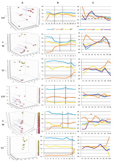 Colorations and corresponding model of change dynamics of petals of three layers at 12 development stages. L-O, L-M, and L-I: outer, middle, and inner layers of petals of ‘Jiaoyan zhuanhong’, respectively; C-O, C-M, and C-I: outer, middle, and inner layer of petals of ‘Jiaoyan yanghong’, respectively; (A) CIE systems of colorations, in each individual figures, balls named 1–12 reflected the colors of the 12 development stages (Figure 1), and corresponding color chars were shown in the right; (B) measurements of L*, a* and b* at 12 stages; (C) model of change dynamics of petal colorations: , where measurements of L*, a*, b* as well as E* of two varieties were recorded as l (Jiaoyan zhuanhong) or c (Jiaoyan yanghong), i.e., ; ; Y1–Y10: corresponded to stage 3–stage 12; negative or positive values of indicated corresponding status of coloration changes were decreasing or increasing, respectively; big indicated the tendency was toward great changes while small meant changes became gentle.