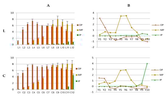 Anthocyanin content and corresponding model of change dynamics of petals of three layers at 12 development stages of both varieties. L: variety ‘Jiaoyan zhuanhong’; C: variety ‘Jiaoyan yanghong’; OP, MP and IP: outer, middle and inner layer of petals, respectively; (A) anthocyanin content measured using pH differential method and displayed with unit (mg 100 g−1 FW), L1–L12, C1–C12: measurements of petals at 12 development stages (Figure 1); (B) Model of Change Dynamics of anthocyanin content: , where measurements of anthocyanin content of two varieties were recorded as l (Jiaoyan zhuanhong) or c (Jiaoyan yanghong), i.e., ; ; Y1–Y10: corresponded to stage 3–stage 12; negative or positive values of indicated change status of anthocyanin content were decreasing or increasing, respectively; big indicated the tendency was toward great changes while small meant changes became gentle.