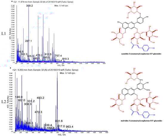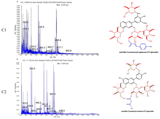 HPLC–MS chromatograms and corresponding structures of major anthocyanins of two varieties of Ranunculus asiaticus L. L1 and L2 were the major anthocyanins of variety ‘Jiaoyan zhuanhong’; C1 and C2 were the major anthocyanins of variety ‘Jiaoyan yanghong’.