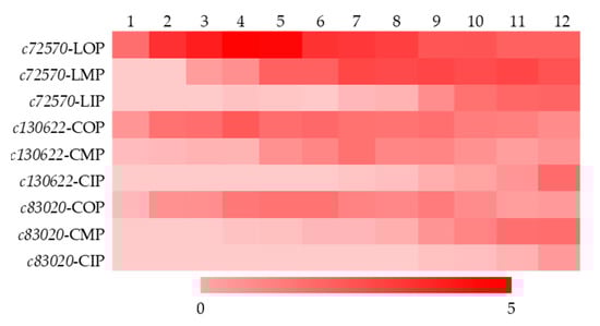 Heat map of gene expression patterns. 1–12: stage 1–12 (Figure 1); c72570, c130622, and c83020 were unigenes annotated as encoding 3GT, 3GT, and 3MAT based on transcriptome sequencing; LOP, LMP, and LIP stood for outer petals, middle petals, and inner petals of variety ‘Jiaoyan zhuanhong’; COP, CMP, and CIP stood for outer petals, middle petals, and inner petals of variety ‘Jiaoyan yanghong’. The darker the color of the square within the heat map, the higher the expression level.