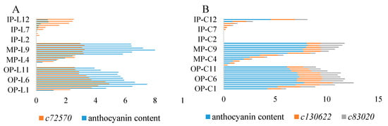Particularly, correlations between anthocyanin contents and gene expression levels were analyzed. It was obvious that anthocyanin contents had significant positive correlation with gene expression levels (Figure 7). Correlation between anthocyanin content of ‘Jiaoyan zhuanhong’ with c72570 was 0.871, while correlations between anthocyanin content of ‘Jiaoyan yanghong’ with c130622 and c83020 were 0.845 and 0.906, respectively.