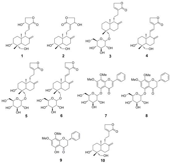 Consequently, a rapid separation method for the diterpene lactones and flavones needs to be established urgently. High-speed counter-current chromatography (HSCCC) could be promising due to its advantages mentioned above. However, the traditional unidimensional HSCCC separation for complex extracts usually leads to the acquisition of a small number of purified compounds. To obtain more compounds, a newly developed strategy, two-dimensional (2D) HSCCC, has been used, which has been divided into two main classes: on-line and off-line 2D HSCCC, the former usually needs two HSCCC separation apparatus, and the latter is much easier [9]. Herein, an off-line 2D HSCCC method was successfully applied for the separation of seven diterpene lactones, andrographolide (1), isoandrographolide (2), neo-andrographolide (3), 14-deoxy-11,12-didehydroandrographolide (4), 14-deoxyandrographiside (5), 14-deoxy-11,12-didehydroandrographiside (6), 3,14-dideoxyandrographolide (10), and three flavones, andrographidine C (7), andrographidine A (8), 5-hydroxy-7,8-dimethoxyflavanone (9), from A. paniculata (Figure 1).