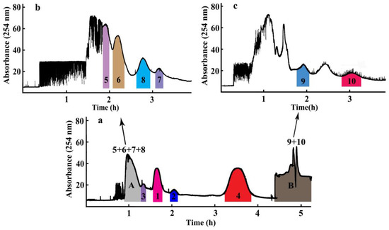Two-hundred milligrams of A. paniculata crude extract was successfully separated by an off-line 2D HSCCC separation using the solvent system of petroleum ether-ethyl acetate-methanol-water with three different ratios of 3:7:5:5, 2:8:1:9, and 5:5:6:4. As shown in Figure 3a, four compounds (1–4) were successfully separated in the 1D HSCCC by the solvent system of petroleum ether-ethyl acetate-methanol-water (3:7:5:5, v/v). However, the relatively close KD-values of compounds 5 (0.12), 6 (0.15), 7 (0.23), and 8 (0.22) rendered these four compounds co-eluted as one peak in part A, and the relatively smaller polarities of compounds 9 and 10 rendered these two compounds mainly distributed in the upper phase, which were eluted together in part B at the end of the separation. Consequently, an off-line 2D HSCCC method was applied to increase their peak capacities and clearly separate them. First, part A (55 min to 79 min) and part B (the flow out fraction) in the 1D HSCCC were concentrated to dryness for the subsequent 2D HSCCC separation. Second, the enriched part A for compounds 5–8 was subjected to one more hydrophilic solvent system of petroleum ether-ethyl acetate-methanol-water (2:8:1:9, v/v), and four peaks corresponding to compounds 5–8 appeared in the 2D HSCCC chromatogram of Figure 3b. Subsequently, the enriched part B for compounds 9 and 10 was subjected to one less hydrophilic solvent system of petroleum ether-ethyl acetate-methanol-water (5:5:6:4, v/v), and two peaks corresponding to compounds 9 and 10 appeared in the 2D HSCCC chromatogram of Figure 3c. Finally, after the off-line 2D HSCCC separation run, 14.4 mg of andrographolide (1), 3.1 mg of isoandrographolide (2), 7.8 mg of neo-andrographolide (3), 18.0 mg of 14-deoxy-11,12-didehydroandrographolide (4), 5.1 mg of 14-deoxyandrographiside (5), 4.4 mg of 14-deoxy-11,12-didehydroandrographiside (6), 2.4 mg of andrographidine C (7), 3.3 mg of andrographidine A (8), 4.0 mg of 5-hydroxy-7,8-dimethoxyflavanone (9), and 7.0 mg of 3,14-dideoxyandrographolide (10), were obtained from 200 mg of the A. paniculata crude extract, with purities all over 90.0% determined using HPLC.