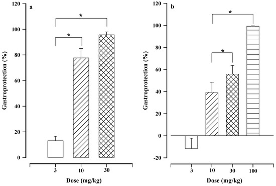 Gastroprotective effect of calein D (a) and carbenoxolone (b). Bars represent the mean ± SEM (n = 7). * p < 0.05, based on the Kruskal−Wallis test followed by Dunn’s multiple comparison.