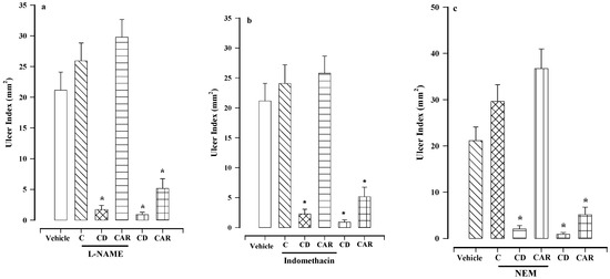 Effect of calein D (CD) and carbenoxolone (CAR) on gastric lesions induced by ethanol in mice pretreated with NG-nitro-l-arginine methyl ester (l-NAME) (70 mg/kg) (a), indomethacin (10 mg/kg) (b) or N-ethylmaleimide (NEM) (10 mg/kg) (c). C = the control group for the distinct inhibitors. Bars represent the mean ± SEM (n = 7). * p < 0.05 vs. the respective control, based on the Kruskal−Wallis test followed by Dunn’s multiple comparison.