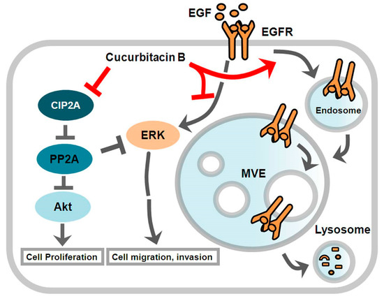 Cucurbitacin is a natural tetracyclic triterpenoid compound mainly found in Cucurbitaceae [9]. In China and India, the use of Cucurbitaceae as an herbal medicine is based on its different biological activities, such as its anti-diabetic, anti-inflammatory, and anti-cancerous activities against different cancer types [19,20]. Cucurbitacin B (CuB), one of the most important members of the cucurbitacin family, has been shown to have antiplasmodial, immunomodulatory, hepatoprotective, antioxidant, cardiovascular, anthelmintic, anti-inflammatory, and anti-fertility activities [21]. Recently, several studies have reported that CuB-mediated anti-cancer activities are mainly mediated through the activation of apoptosis, cell cycle arrest, and autophagy, as well as through the suppression of the STAT3 and Raf/MEK/ERK pathways [22]. However, no study has examined the efficacy of CuB in gefitinib-resistant (GR) NSCLC. This study is the first to report that CuB induces EGFR degradation and has CIP2A/PP2A/Akt inhibitory activities in GR NSCLC cells.