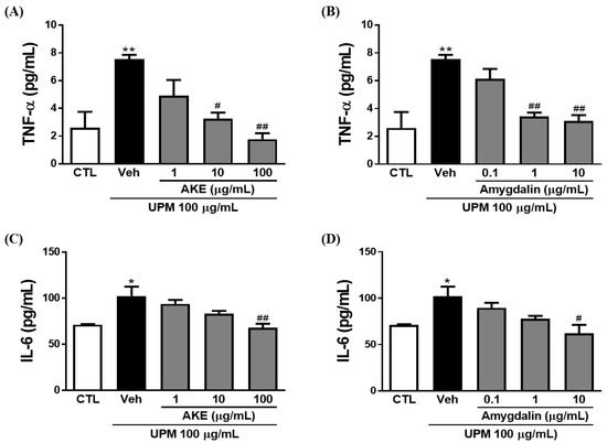 To investigate the effects of AKE and amygdalin on inflammatory factors, including tumor necrosis factor (TNF)-α and interleukin (IL)-6, enzyme-linked immunosorbent assay (ELISA) and quantitative polymerase chain reaction (qPCR) were performed in conjunctival epithelial cells. The release of TNF-α was increased by 100 μg/mL UPM exposure (7.5 ± 1.15 pg/mL). These increments of release were significantly decreased by 10 and 100 μg/mL AKE (3.3 ± 0.44 pg/mL and 1.8 ± 0.44 pg/mL, respectively) and 1 and 10 μg/mL amygdalin (3.4 ± 0.28 pg/mL and 3.1 ± 0.44 pg/mL, respectively) (Figure 6A,B). In addition, mRNA expression of TNF-α was increased by 100 μg/mL UPM exposure (12.6 ± 2.57 fold and 10.3 ± 0.67 fold); this was significantly recovered by 100 μg/mL AKE (3.8 ± 0.37 fold) and 0.1, 1, and 10 μg/mL amygdalin (3.2 ± 0.80 fold, 2.3 ± 1.15 fold, and 0.69 ± 0.32 fold, respectively; Figure 6E,F).
