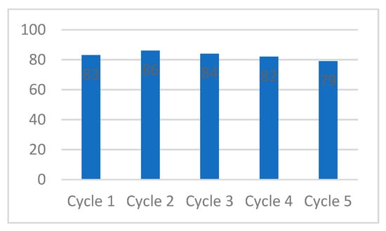 Aqueous solutions of four different hydroxide IL containing different cations, i.e., benzyltrimethylammonium (BTMA-OH), choline (Choline-OH), hexadecyltrimethylammonium (HDTMA-OH) and tetrabutylammonium (TBA-OH), were tested. Due to the limited solubility of substrates in these solvents, the addition of 10% non-polar conventional solvent (toluene) was necessary. Interestingly, among the tested systems, only one IL, Choline-OH, could be used without the addition of a base, resulting in the formation of the product 7a in 83% yield (entry 4, Table 3). We found that the IL can be regenerated and recycled into the reaction with only a slight decrease in product yield after five cycles (Figure 1).