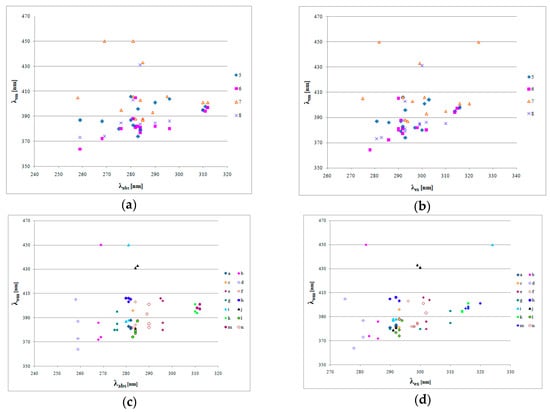 Absorption-emission or excitation-emission maxima of studied compounds: (a) Absorption-emission maxima of studied compounds containing ethyl (5a–n), propyl (6a–n), butyl (7a–n) and hexyl (8a–n) substituents; (b) excitation-emission maxima of studied compounds containing ethyl (5a–n), propyl (6a–n), butyl (7a–n) and hexyl (8a–n) substituents; (c) absorption-emission maxima of studied compounds containing different aryl substituents; (d) excitation-emission maxima of studied compounds containing different aryl substituents.