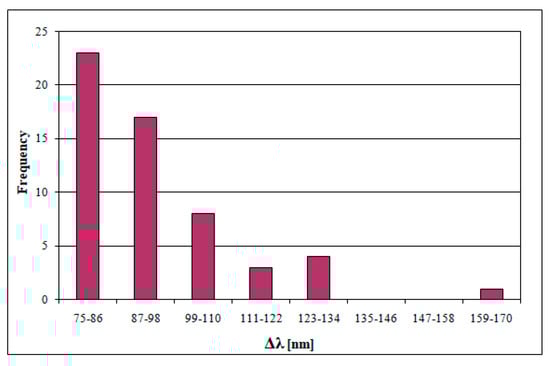 The determined optimal excitation wavelengths are similar to those registered for 1,2,4-triazole and certain bromo derivatives; however, in our case, the calculated quantum yields were much greater than the ones for 1,2,4-triazole and the above-mentioned derivatives (up to four orders of magnitudes, e.g., Φ1,2,4-triazole = 5 × 104) []. The differences between the excitation and emission wavelengths at global maxima of 3D fluorescence spectra vary from 75 nm to 168 nm, with the most populated value at ca. 80 nm (Figure 4). The largest shift in wavelengths occurred for compound 7b, which upon absorption of ultraviolet light emitted a strong blue fluorescence. Such shift is rare, as typically fluorescent compounds possess emission wavelengths separated by less than 100 nm from excitation wavelengths. Upon irradiation by UV light, 7i emitted a blue light and compounds 7j and 8j emitted a violet light visible by the naked eye.