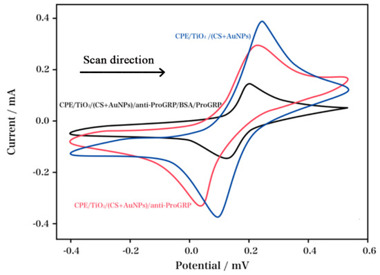 The cyclic voltammetry (CVs) of different electrodes: carbon paste electrode (CPE)/TiO2/(CS+AuNPs), CPE/TiO2/(CS+AuNPs)/anti-progastrin-releasing peptide (ProGRP) and CPE/TiO2/(CS+AuNPs)/anti-ProGRP/BSA/ProGRP.