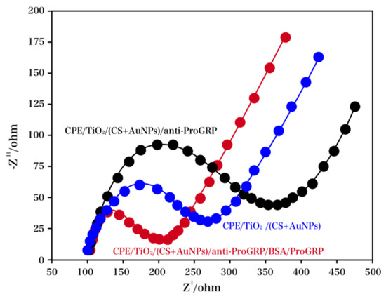 The electrochemical impedance spectroscopy (EIS) characterization recorded for different electrodes: CPE/TiO2/(CS+AuNPs), CPE/TiO2/(CS+AuNPs)/anti-ProGRP and CPE/TiO2/(CS+AuNPs)/anti-ProGRP/BSA/ProGRP.