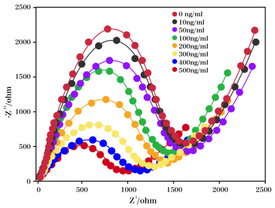 Electrochemical impedance response recorded for CPE/TiO2/(CS+AuNPs)/anti-ProGRP/BSA/ProGRP immunoelectrode as a function of ProGRP concentration over the range of 10 to 450 ng/mL.