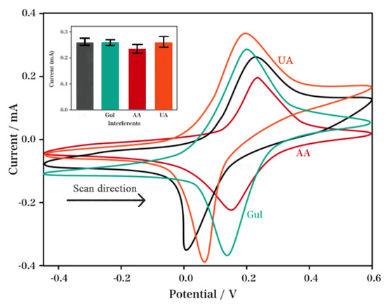 The specificity of CPE/TiO2/(CS+AuNPs)/anti-ProGRP/BSA/ProGRP was investigated by incubating this immunoelectrode with 15 μL of pathogens and metabolites, including 300 ng/mL of ProGRP, 5 mM of ascorbic acid, 5 mM of uric acid, and 5 mM of glucose. As shown in Figure 4, after these pathogens were added into the proposed electrode, the electrochemical response showed no variations during the experiments, which suggested that the probe for ProGRP was highly specific.