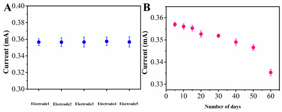 For the investigation of the reproducibility of the immunoelectrode, ProGRP (300 ng/mL) was used with the proposed electrode, while the variation in the current magnitude was recorded. As shown in Figure 5A, no apparent variation was observed, which suggested that this electrode was highly precise. The CVs (Figure 5B) of our proposed immunoelectrode were recorded for ca. 30 d (10 d intervals) to study its storage stability. During the 30 days, no apparent current variation was observed; afterwards, the current showed a 4% variation from the original value. These results indicated a remarkable storage stability of our proposed electrode, for as long as 30 d.