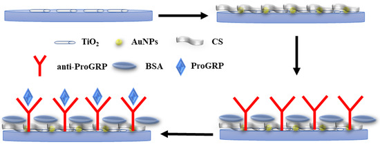 ProGRP and anti-ProGRP were commercially available in Shengyuan Biotech Inc., Shenzhen, China. All test reagents were of analytical grade. For all experiments, the supporting electrolyte was a pH 7 KH2PO4 buffer solution (PBS), where 1 M NaOH was added to adjust the pH value. The following were purchased from XFNANO Co. Ltd (Nanjing, China): Acetic acid; commercial AuNPs; CS monomer, for the preparation of TiO2NPs, Ti(OCH(CH3)2)4; absolute ethanol, for synthetic serum preparation of NaCl; CaCl2; N-Ethyl-N-(3-dimethylaminopropyl) carbodiimide (EDC); N-hydroxysuccinimide (NHS); KCl; urea, which was commercially available in Sigma-Aldrich (Shanghai, China); and Au nanoparticles with an average size of 20 nm (0.05 mg/mL).