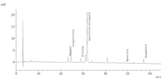 The flavonoid components of all 12 samples were separated using the HPLC-photodiode array detector (DAD) method. For this operation, a chromatogram of November’s tea (Figure 1) was obtained at 350 nm. By comparing the retention times with reference substances, six peaks were qualitatively analyzed and quantified. The retention time of hyperin was 24.39 min, isoquercitrin was at 25.69 min, trifolin was at 29.91 min, and quercitrin and astragalin were both observed at 32.91 min. With their weak polarity, quercetin and kaempferol were observed at 49.72 min and 58.13 min, respectively. What distinguished the picking months was not the constituents but rather the individual and total percentages. For the total monomers contents, December and September were the richest months. The comparative contents of characteristic flavonoid compounds are listed in Table 2.