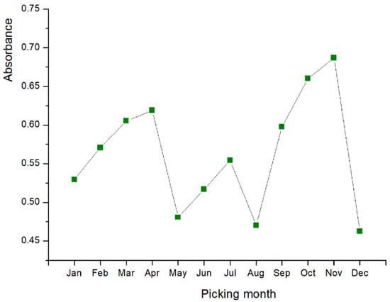 Both quercitrin and astragalin have been found to be important as antioxidants. Truong et al. [] reported that quercitrin can act against acetaminophen (APAP)-induced hepatotoxicity through the enhancement of the activity and expression of antioxidant enzymes, and Cho et al. [] reported that astragalin may be a potent agent in antagonizing endotoxin-induced oxidative stress, which can lead to airway dysfunction and inflammation. Among the detected components a rich amount of quercitrin and astragalin was uncovered, but the two monomers were superimposed in a much higher peak, even though a range of conditions were tested, which is inconsistent with previous qualitative analysis []. The difficulty in isolating the two isomers may result from the number of hydroxyls and similar polarity. Therefore, the two similar compounds were quantitatively analyzed by calculating their sum according to the approximate absorption coefficient values (350 nm). The total content of the two constituents was the highest throughout the entire year. The contents of the two components in September and November tea were the highest at 461.9 and 447.32 μg/g, respectively, followed by February (401.43), October (379.85), June (369.04), August (354.27), July (346.20), April (311.28), May (301.28), December (278.99), March (269.80), and January (232.63).