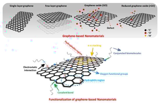 Overview of the various structures of graphene-based nanomaterials (GNs) and the illustration of covalent/non-covalent functionalization of these nanomaterials.