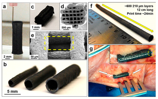 Photographs showing standing strength of 3D graphene ink printed (60% graphene content) nerve conduits (a), tubes of variable sizes (b), uniaxial multichannel nerve guide (c,d), SEM micrograph of in-between layers of nerve guide (e), a high aspect ratio (24:1) 5 mm diameter hollow tube (f), and nerve conduit implanted in human cadaver, demonstrating flexibility and ease of handling of 3D graphene ink (g). This shows the flexibility and ease of clinical handling of the graphene ink. Image retrieved from [62] with permission.