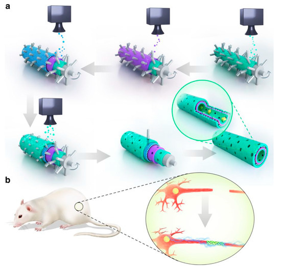 Peripheral nerve injury (PNI) has been widely reported to be an essential cause of incapability in the clinical setting. Patients suffering from this disease encounter many challenges including pain, sensory loss, impaired movement, and cold intolerance, which have a significant adverse impact on their daily life [1]. The most common therapeutic strategy for PNI is painstaking microsurgical mending by tensionless epineural sutures. Even with a substantially increased understanding of neuropathophysiology, there is still a lack of appropriate strategies for accelerated growth and complete recovery of axon during the neurorepair [2,3]. While neurons are the most vital part of both neural systems, they cannot perform mitosis, and supporting glial cells can only divide with limited capacity. In addition to slow/inability to heal, protease activity degenerates distal ends after a nerve is severed. Hence, the human neural system cannot regenerate by itself naturally and is prone to permanent damage due to injury and disease. Recently, increasing evidence has showed that neural tissue engineering is able to help neural cells recover using constructs such as scaffolds, sheets, and nanoparticles fabricated through bioengineering, which actively stimulates nerve regeneration through topological, physiochemical and biological cues by incorporation of biocompatible materials and therapeutic molecules such as growth factors [4,5]. In particular, flexible materials are favored for neural regeneration due to their ability to recapitulate and support intrinsic tissues.