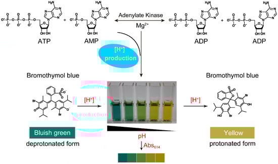 In this study, Adk activity was determined by a direct and continuous spectrophotometric technique without coupled enzymes. In the enzymatic reaction catalyzed by Adk, the formation of two ADPs from ATP and AMP is accompanied by the generation of hydrogen ions. Bromothymol blue is an excellent acid–base indicator as it forms a highly conjugated structure while protonated in acid solution, resulting in an obvious color change from blue to yellow. The absorbance of bromothymol blue at 614 nm is associated with the hydrogen ion concentration in solution. Thus, Adk activity can be monitored in real time by the absorbance of bromothymol blue at 614 nm in solution, which can be detected by a sensitive spectrophotometer. The principle of this assay is illustrated in Figure 1.