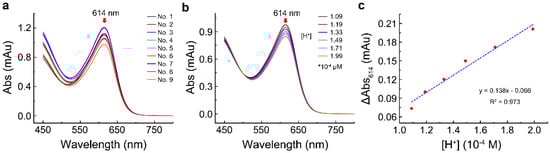 The maximum absorption wavelength of the reaction mixture and its relationship with the hydrogen ion concentration. (a) The absorption spectra of nine different combinations in the presence of 5 mM MgAC2; (b) effect of hydrogen ion concentration on the absorption of the reaction system; (c) the correlation of the absorbance change of bromothymol blue at 614 nm with hydrogen ion concentration.