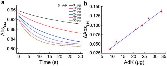 The effect of Adk contents on the reaction velocity was determined as described in the Materials and Methods section. The results showed that, with the increase in Adk contents, the reaction velocity increased, and the reaction time required to reach equilibrium shortened (Figure 3a). In the first 5 s, the absorbance of bromothymol blue at 614 nm (Abs614) declined linearly with time; thus, the slope of the reaction in the first 5 s was defined as the initial reaction velocity. The plot in Figure 3b shows that the absorbance change of bromothymol blue at 614 nm could be linearly fitted as the function of Adk contents.