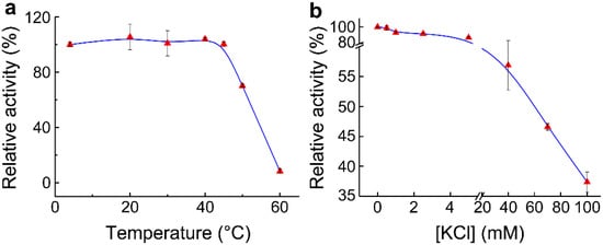 The thermostability of Adk and the inhibition of KCl on Adk activity. (a) Effect of temperature on Adk activity; (b) effect of KCl concentration on Adk activity.