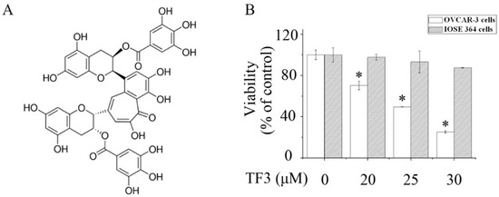 Theaflavin-3,3′-digallate (TF3) selectively reduced the viability of ovarian cancer cells. (A) Chemical structure of TF3. (B) The viability of human ovarian carcinoma (OVCAR-3) cells and normal human immortalized ovarian surface epithelial cells (IOSE 364) cells exposed to TF3. * p < 0.05 compared with the control group.