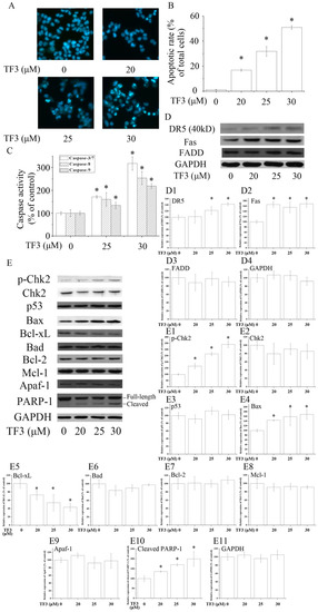 Theaflavin-3,3′-digallate (TF3) induced apoptosis in human ovarian carcinoma (OVCAR-3) cells. (A,B) Hoechst 33342 staining assay. (C) TF3 activated caspases in OVCAR-3 cells. (D,E) TF3 influenced apoptosis-related proteins. (D1–D4 & E1–E11) Densitometry analysis of protein bands. Glyceraldehyde-3-phosphate dehydrogenase (GAPDH) served as a loading control. * p < 0.05 compared with the control group.