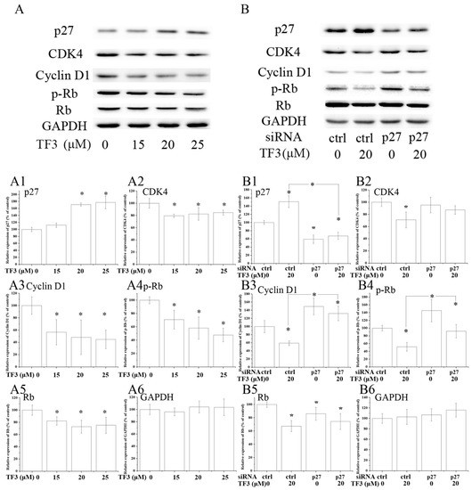 TF3 caused G0/G1 cell cycle arrest in OVCAR-3 cells by up-regulating p27 kip1 (p27). (A) Western blot analysis of TF3-treated OVCAR-3 cells. (B) Knockdown of p27 partially reversed TF3-induced decrease of the expression of cyclin dependent kinase (CDK)4, Cyclin D1, phospho-retinoblastoma protein (p-Rb) and retinoblastoma protein (Rb) in OVCAR-3 cells. (A1–A6 & B1–B6) Densitometry analysis of protein bands. Glyceraldehyde-3-phosphate dehydrogenase (GAPDH) served as the loading control. * p < 0.05 compared with control or between specific groups.