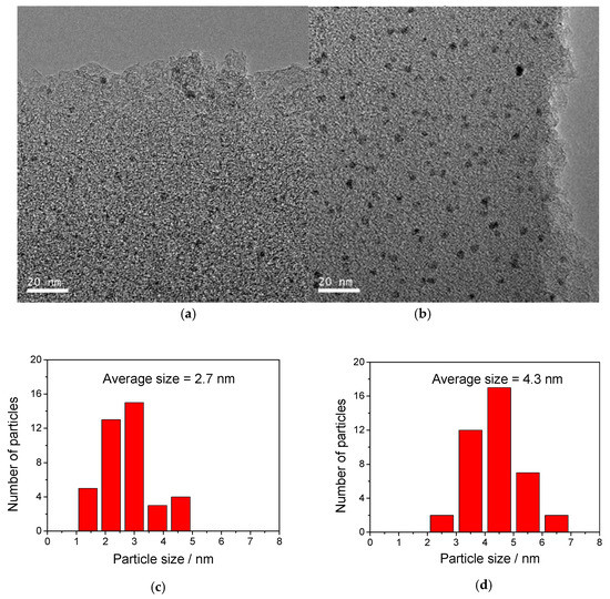 TEM images of (a) spent Pd/AC and (b) spent Pd/N-AC, and Pd size distribution of (c) spent Pd/AC and (d) spent Pd/N-AC in the hydrodechlorination of 2,4-DCP.